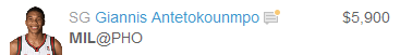 This is a tremendous matchup tonight for Giannis as the Milwaukee Bucks travel into Phoenix to play the run and gun Suns. In a game like this where the tempo is high and the open court creativity is paramount; Giannis excels. Over his last four games he is averaging 17.5 ppg, 5.8 rpg and 1.5 blocks per game, not bad numbers for the price here. This game tonight figures to be fast-paced and pretty high scoring, there will be a significant lack of defense and plenty of opportunity to score some good fantasy points here.