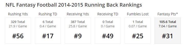 Sproles, who averaged 1.09 fantasy points per touch last season, could be in a good position to be an under-the-radar FLEX performer if given more touches this year. Heck, Murray averaged just 0.66 points per touch in 2014. While that's obviously an awkward comparison to make, it just goes to show us what type of a fantasy impact Sproles can make. Give him just three more touches per game, and he's right up there among the top-20 fantasy running backs in the NFL.