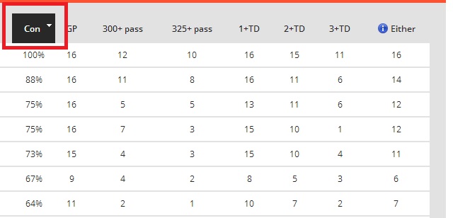 Quarterback: Either 300-plus passing yards or two-plus touchdowns. If a quarterback hits that plateau during a given game, his consistency rankings goes up. If not, it goes down. For example, Alex Smith hit either mark in nine of his 15 starts. That put his consistency percentage at 60 percent.
