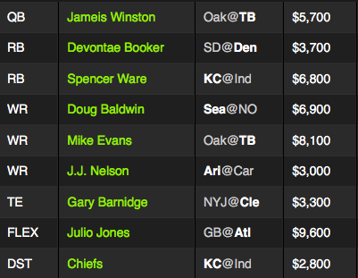 There's a case to be made that Jameis Winston is a top-seven quarterback play this week. A matchup against a porous Oakland Raiders defense sets up perfectly for Tampa Bay's offense, even without Vincent Jackson. While the Bucs' offense struggled early, it has been a strong unit since Jacquizz Rodgers emerged as the team's effective workhorse back when Doug Martin went out. Winston and Mike Evans have a strong connection and it's a big reason why we are going to pair the two together. While we are certainly paying for Evans chance to finish as the top scoring receiver in DFS this week, we are getting great value with Winston who offers top-five upside.